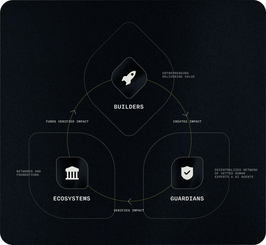Builders: the entrepreneurs delivering that value. They apply for funding, execute milestones, and submit verifiable evidence of results. Builders earn when outcomes are validated, not when promises are made.